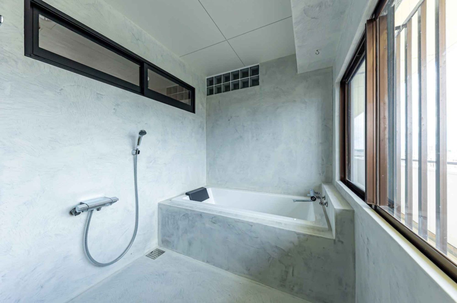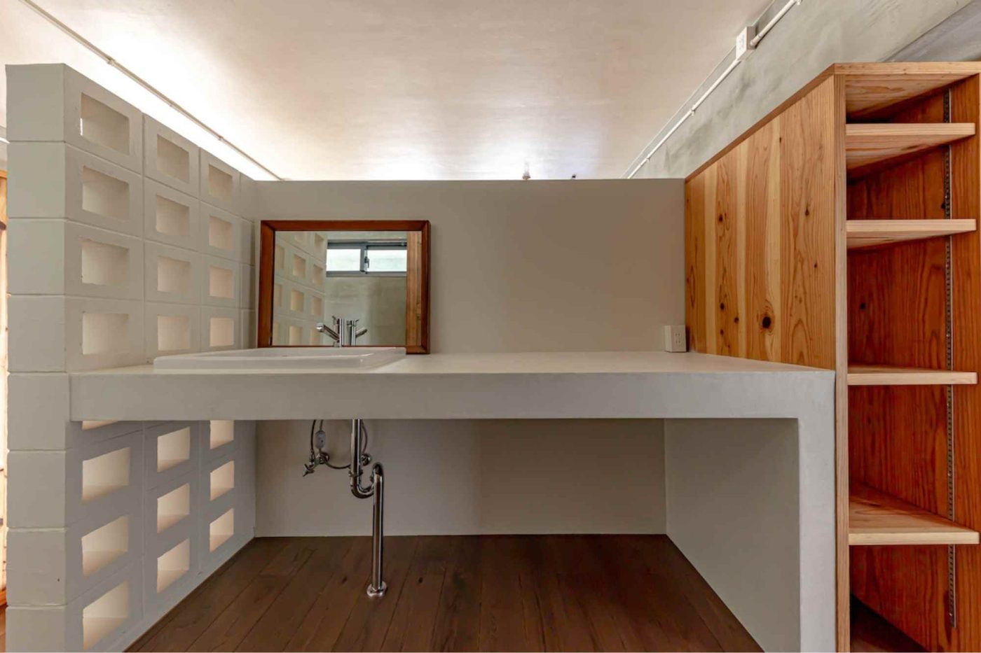 共用廊下からバルコニーへ、風の通り道を作るような断面構成としました。洗面の壁は低くし、浴室には窓を2箇所設けて部屋に風を誘い込みます。