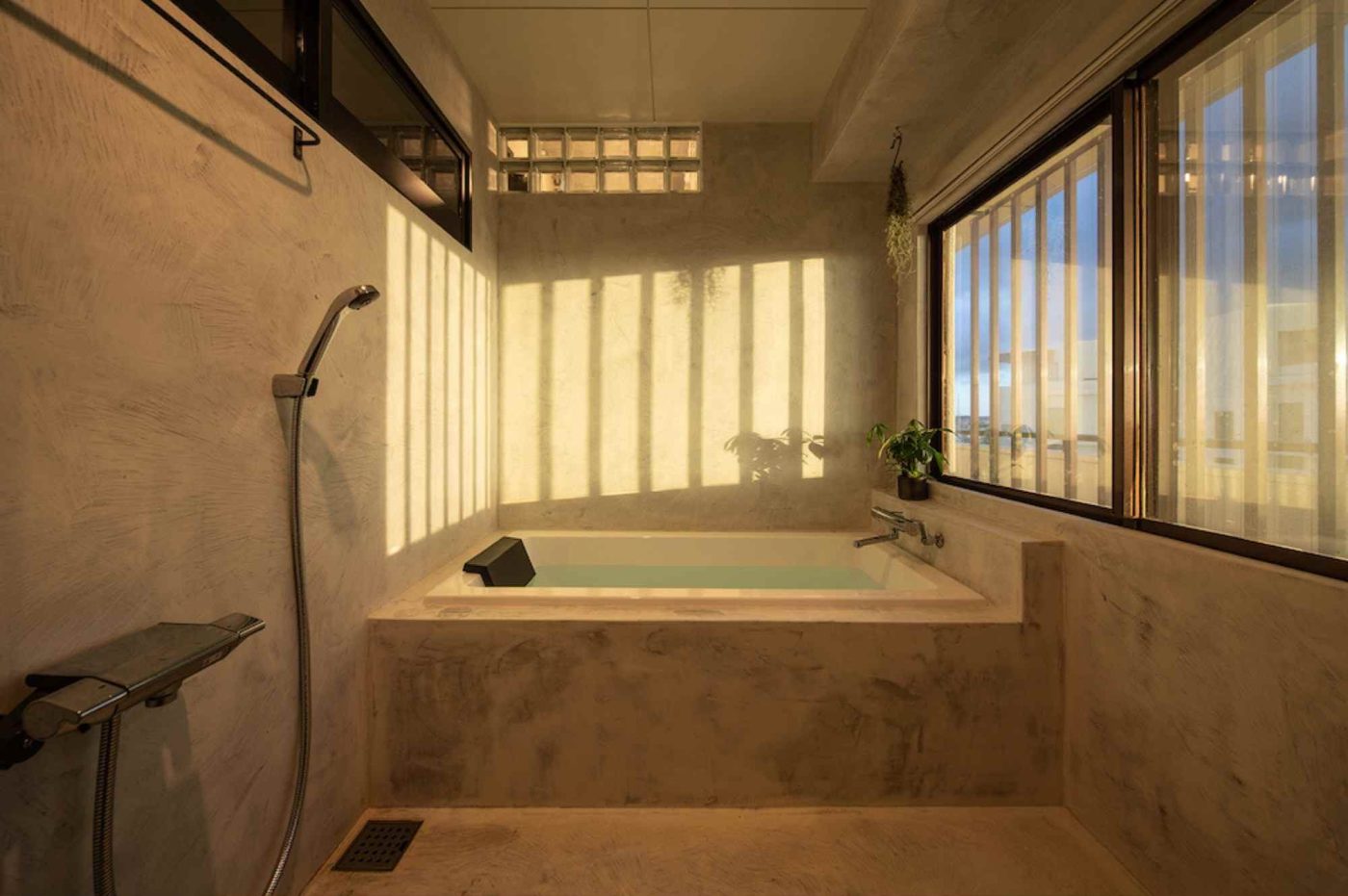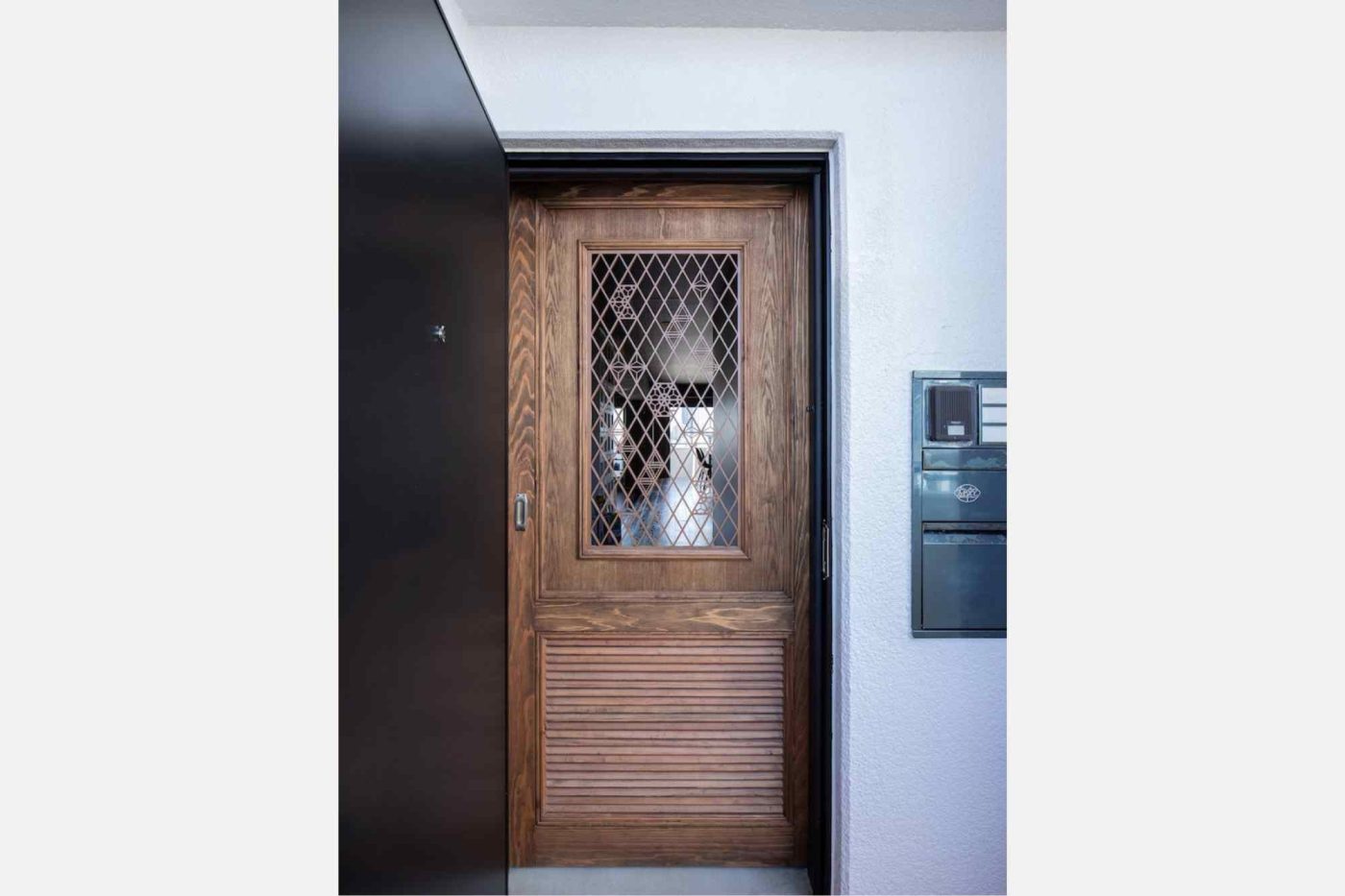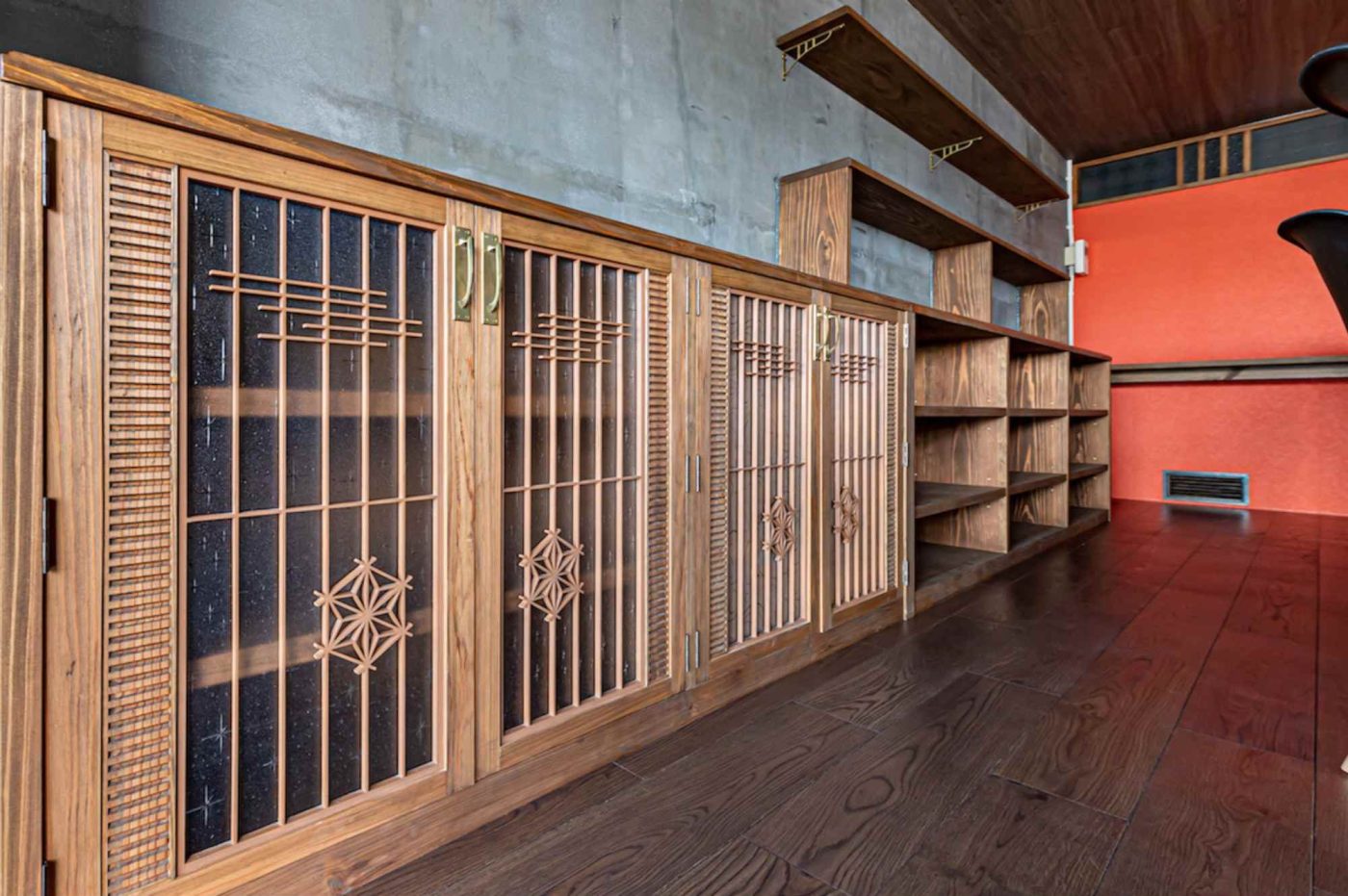 手に触れられる家具や建具には、職人の手仕事が取り入れられています。古民家の欄間をアップサイクルした食器棚、大正ガラスやレトロタイル、左官仕上げの浴室、玄関には採風採光のできる鍵付き二重扉。手仕事と工芸品を尊重し、それらが後世に引き継がれていくことを願っています。