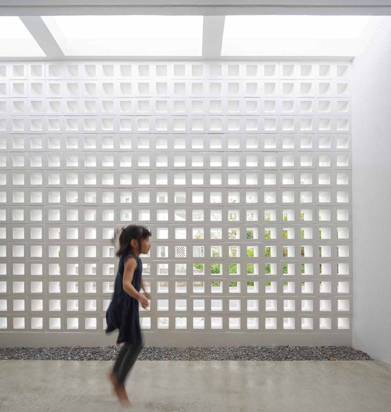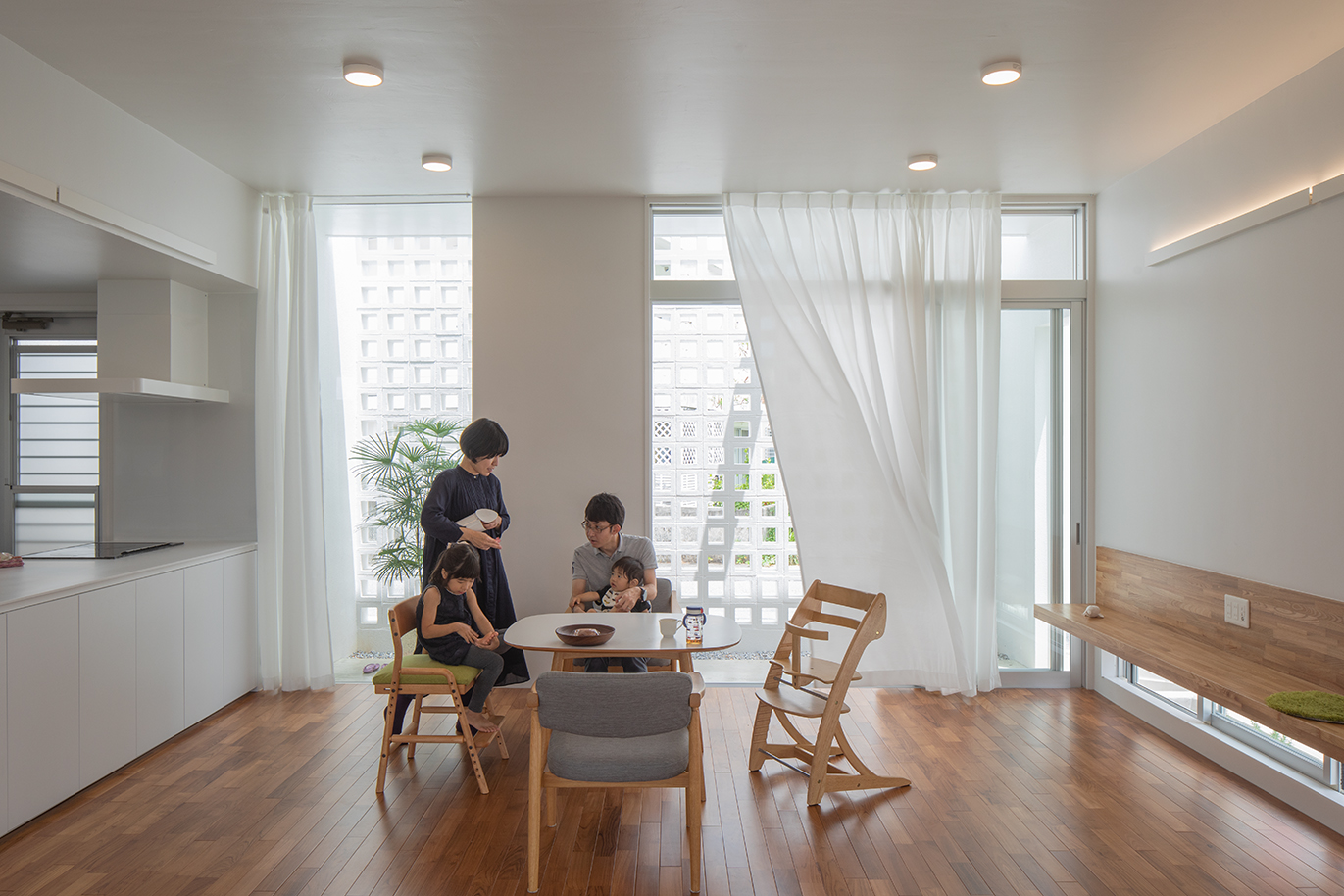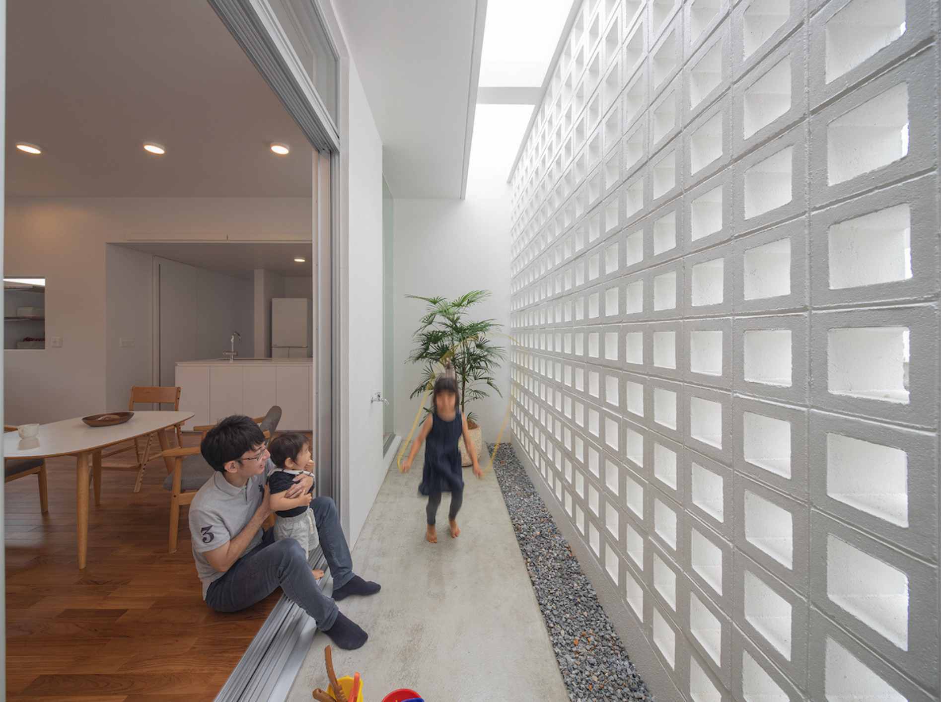 花ブロックは、窓を開けたままの開放的な暮らしができる空間を作り出します。緑化スクリーンともなって室内へ涼風を呼び込み、野菜や植物など緑がもたらす豊かさも取り入れます。さらに、花ブロックを介して光を取り込むと拡散して室内照度が一定になり、明るく感じることができます。