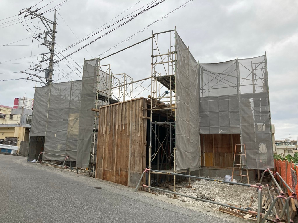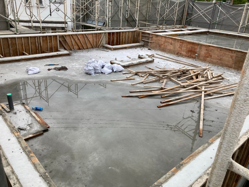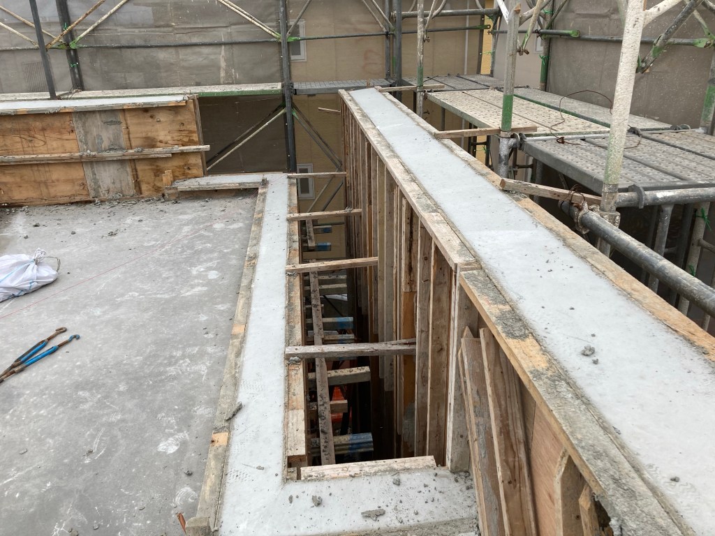 打設後5日め。そろそろ壁の型枠から外していきます。