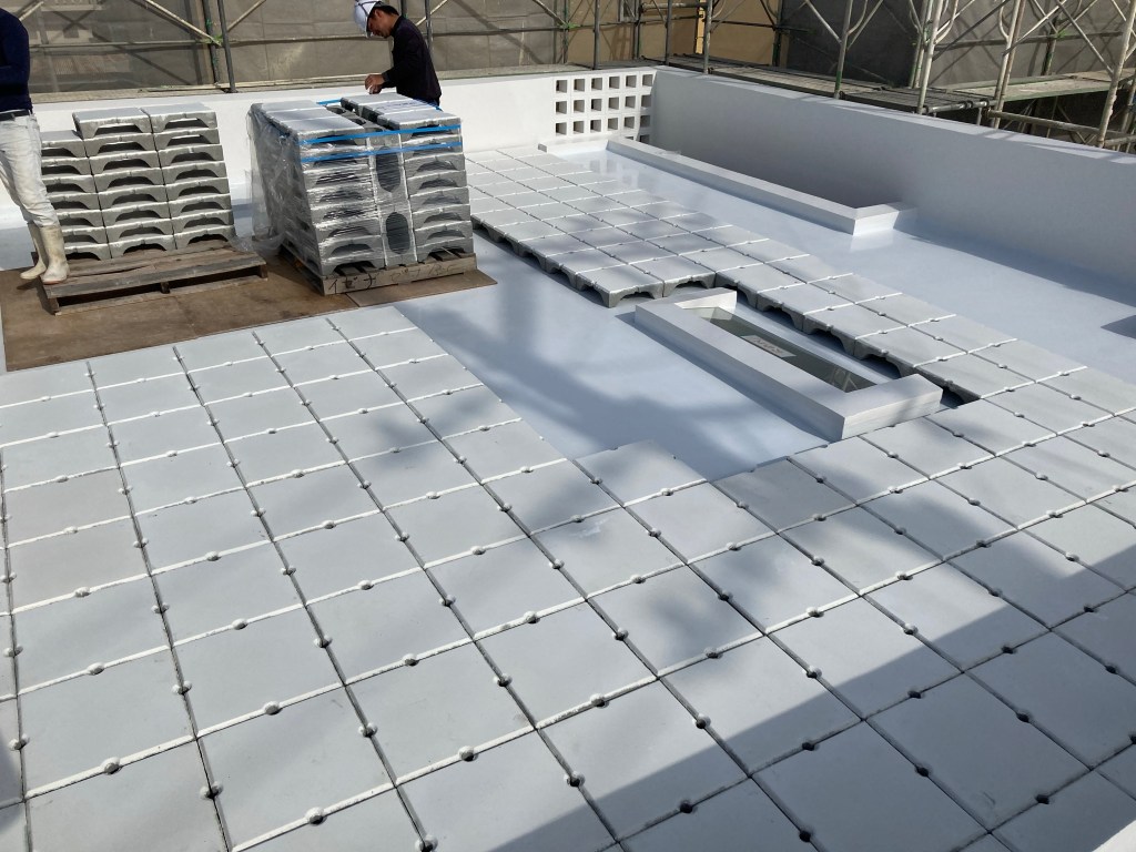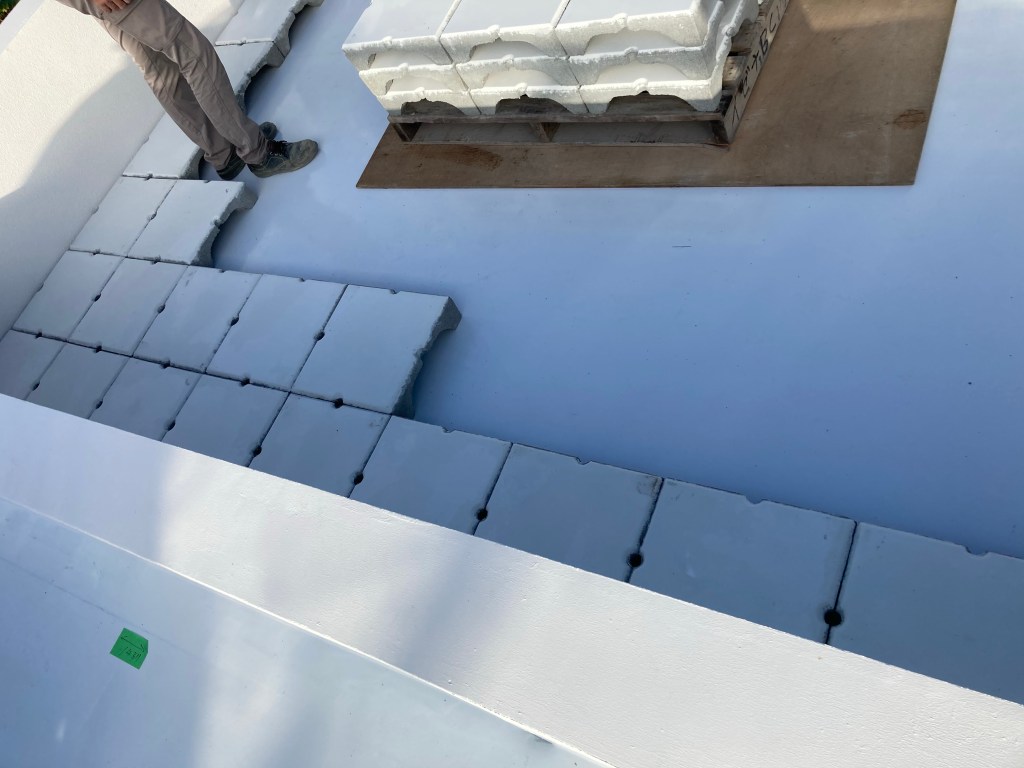 遮熱ブロックに期待するのは、恒久性。日射遮蔽手法の通気と反射のダブルで、熱い日射を遮ります。材料到着から3時間たたないうちに設置完了しました。それにしても今日は、ぽかぽか日和です。