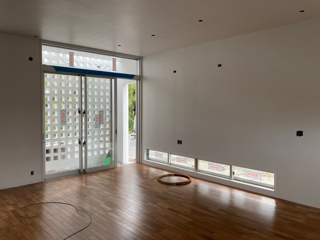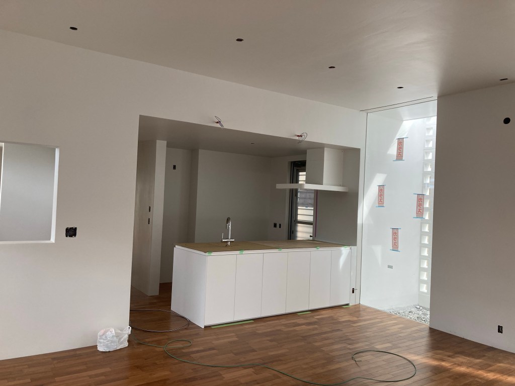 白いキッチン、今回はサンワカンパニーのクビレキッチンを採用しました。この家の雰囲気にぴったりです。