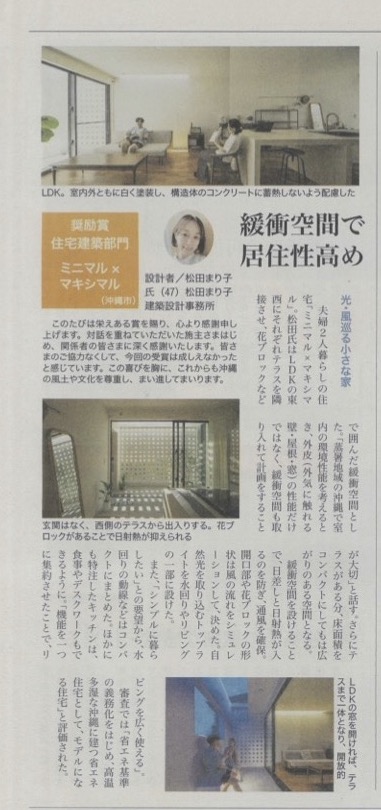 松田まり子建築設計事務所が設計監理した『ミニマルマキシマル』が沖縄建築賞奨励賞を受賞をしました。2024.8.15